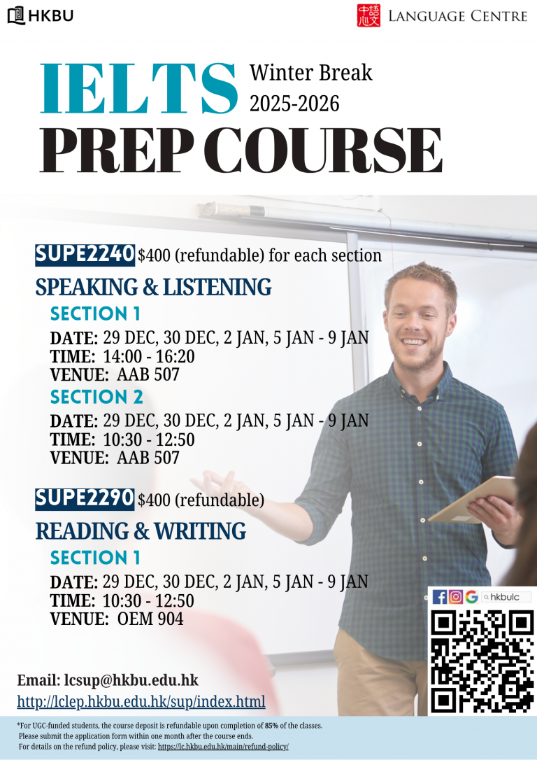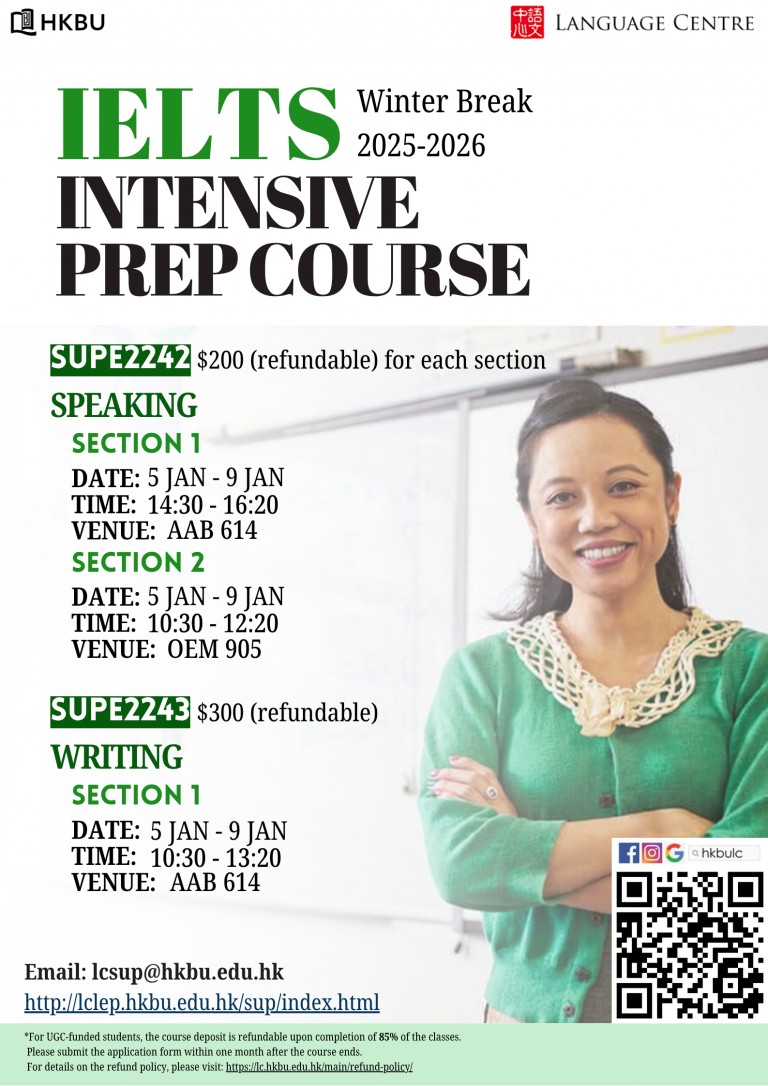 With intensive practice of a wide range of exercises in the four question types of the test (i.e. reading comprehension, error identification, sentence completion and paragraph improvement), this course aims to help students prepare for the “Use of English” paper of the civil service Common Recruitment Examination of the Hong Kong SAR government (CRE).