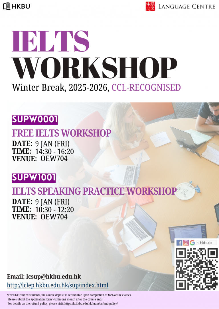 The Language Centre offers a FREE WORKSHOP for students who have not taken an IELTS preparation course and need to know more information about the IELTS Test. The instructors will talk about the 4 modules (LISTENING, SPEAKING, READING AND WRITING), show students some Specimen Papers and provide an opportunity for students to do some selected tasks.
