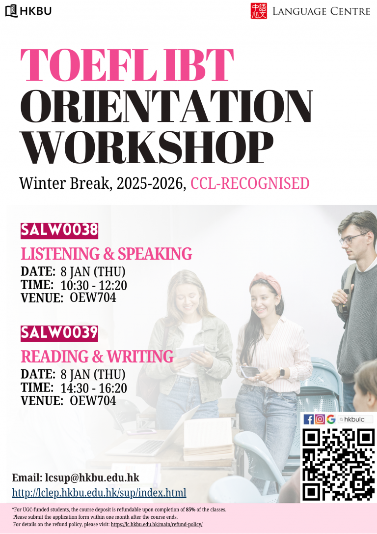 This two-hour workshop will familiarize you with the test format of TOEFL listening and speaking. Useful test tips and hands-on practice will be provided. This workshop is designed for students who have no or minimal exposure to the TOEFL test.